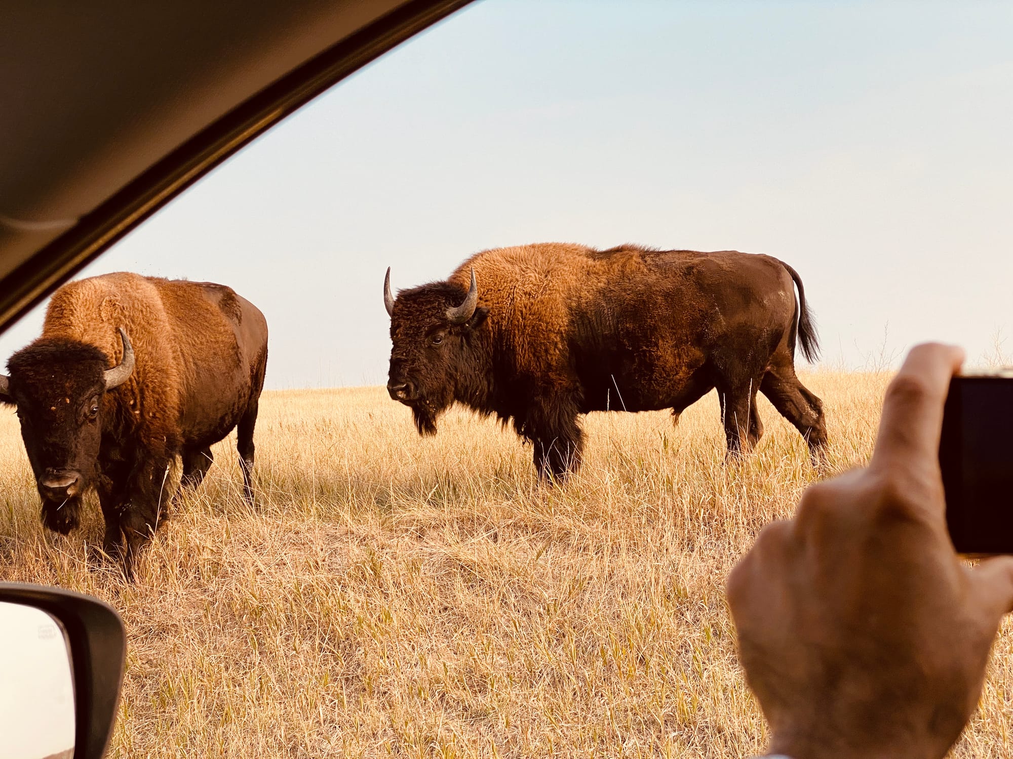 In the infinite expanse of the dry prairies, bison huddled close to the dirt road, posing for our unexpected American ‘safari.’