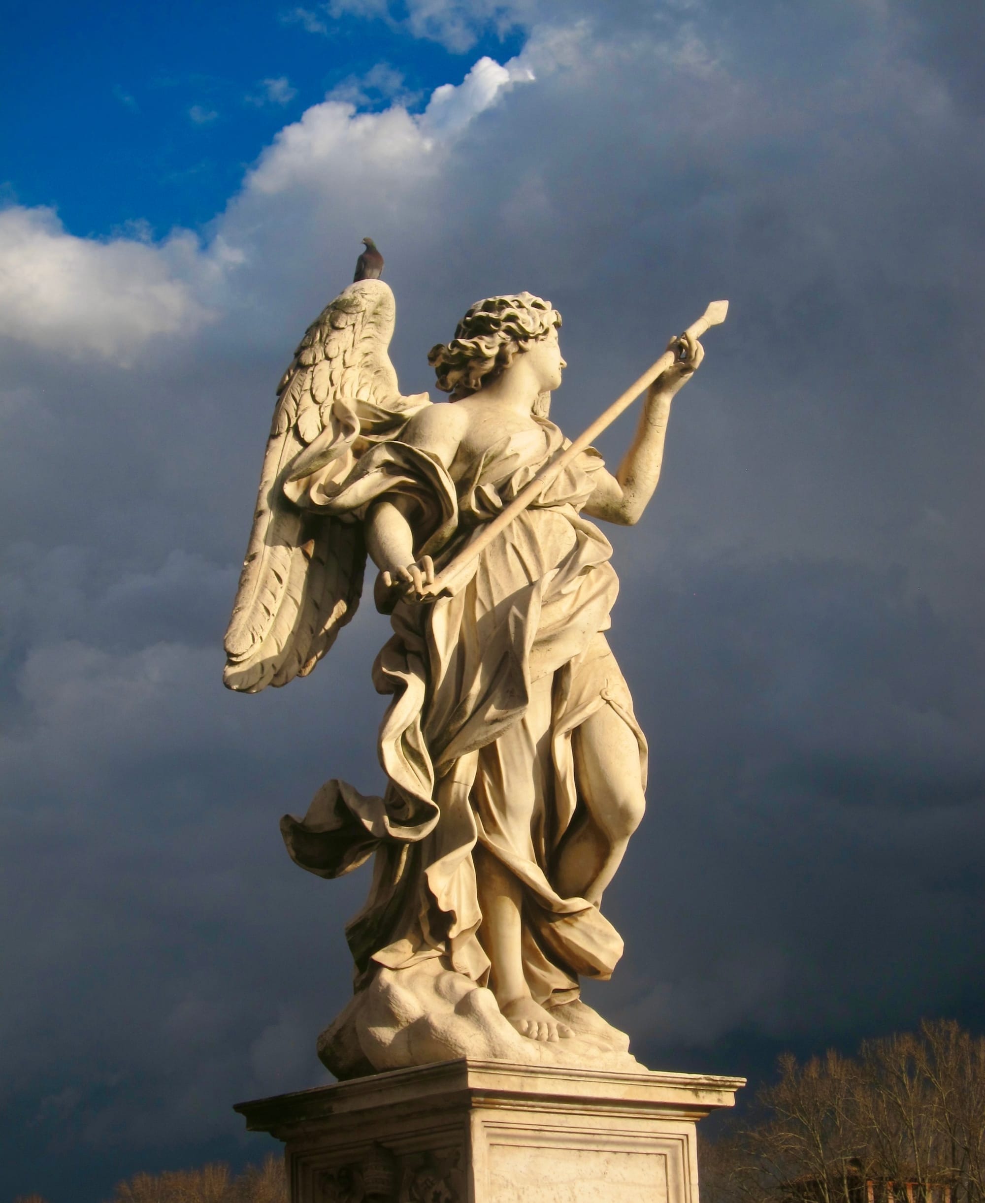 Right after an afternoon storm, sunlight glows upon “Angel with a Lance,” a 15th century sculpture guarding the Tiber River by Bernini’s arch rival Domenico Guidi.