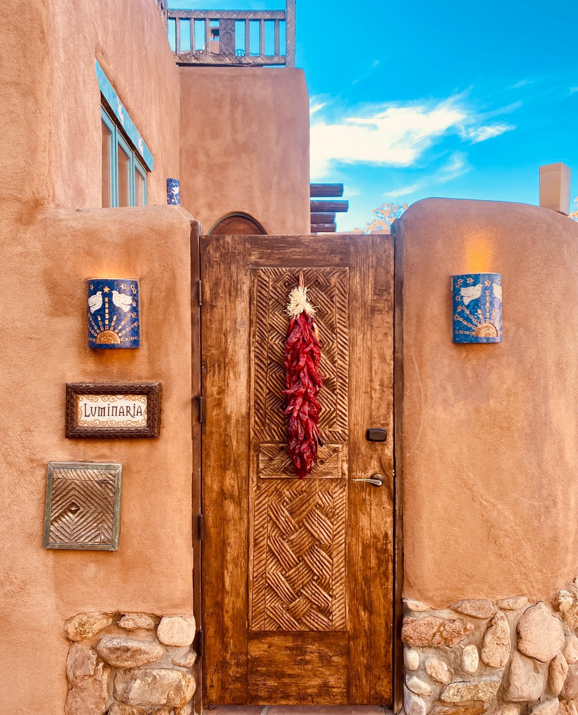 We enter our lovely room–perfectly contextual with dried chilies, ceramic lanterns, and a hand-carved wooden door–just steps from the New Mexican capital.
