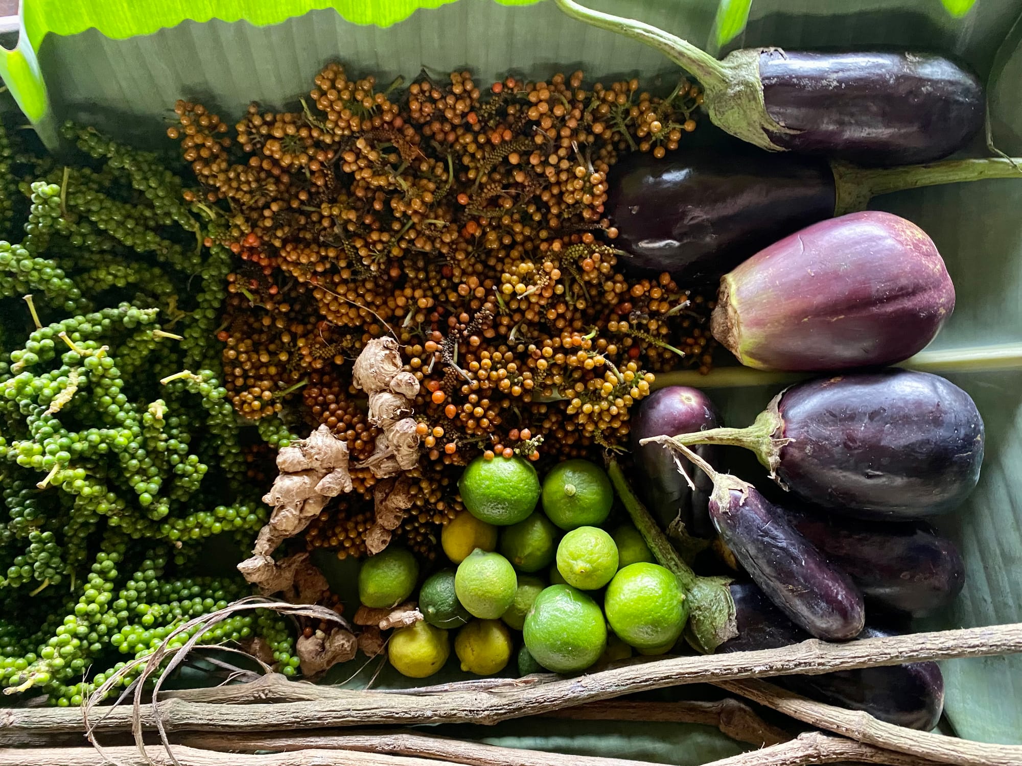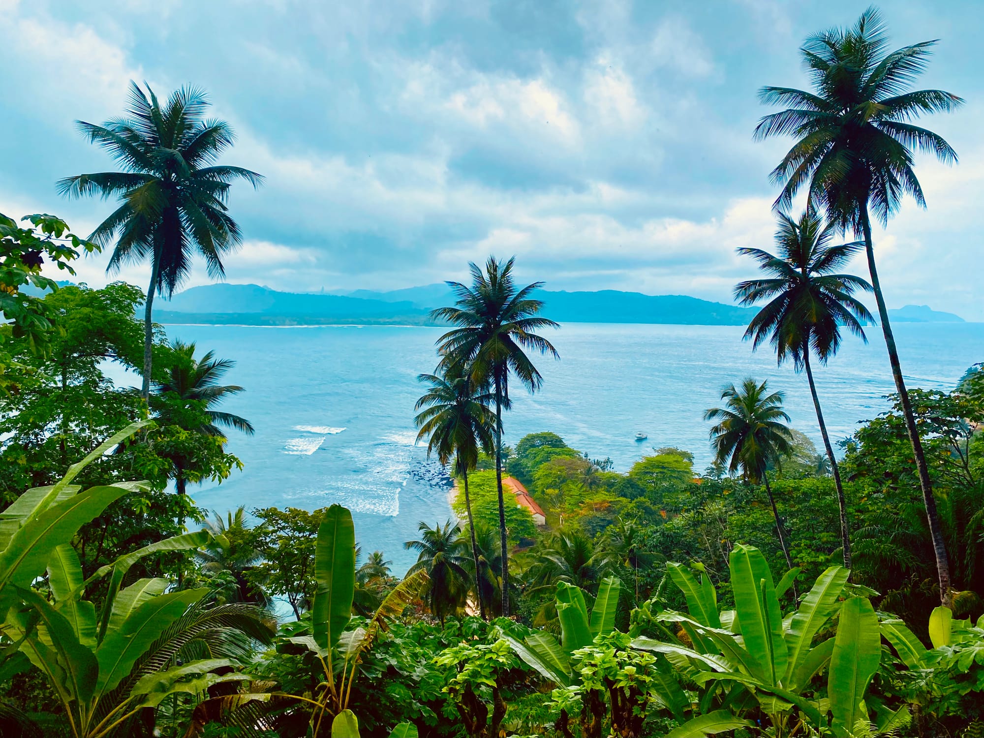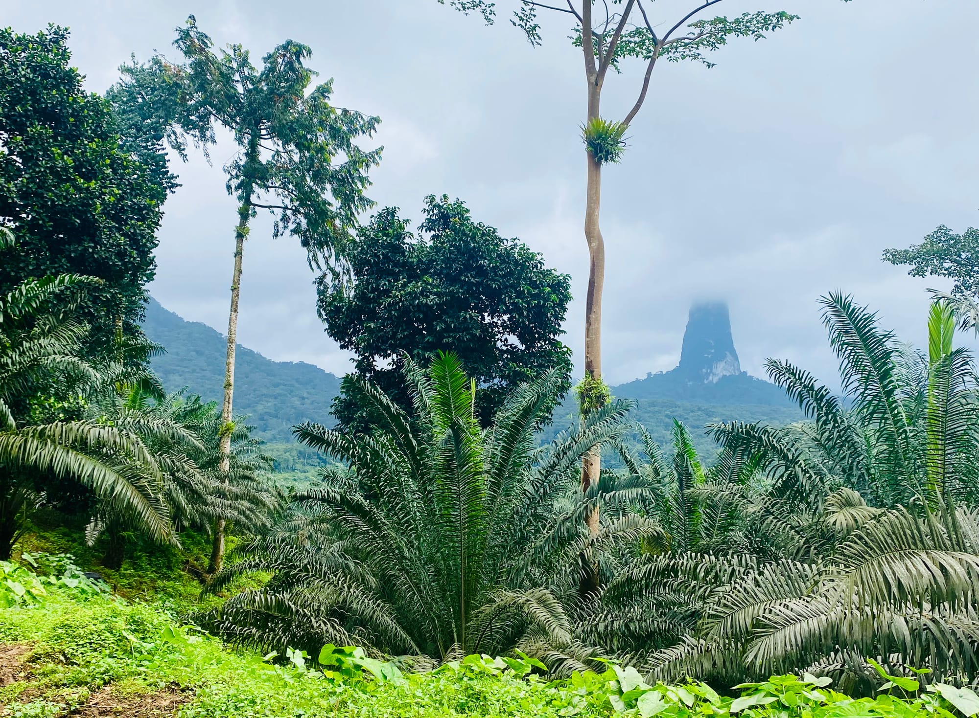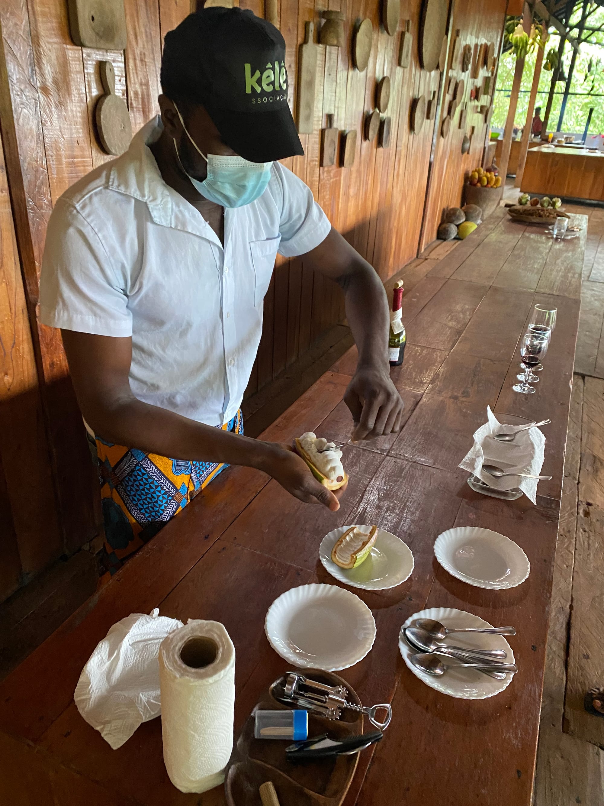 An airy dining room opened to vistas of the rainforest and mountains beyond, with what has to be one of the most presentable open kitchens I’ve seen in a restaurant. Exotic ingredients were on display in bountiful piles, and staff clipped herbs growing off the sides of the railings. Baobab fruits, cacao pods, carambola, turmeric, jackfruit: It was a chorus of tropical earthly delights. When the sous-chef called us to the kitchen for a “tongue spa,” I knew we were in for something special. And so began our refined 11-course taste of São Tomé and Principe.