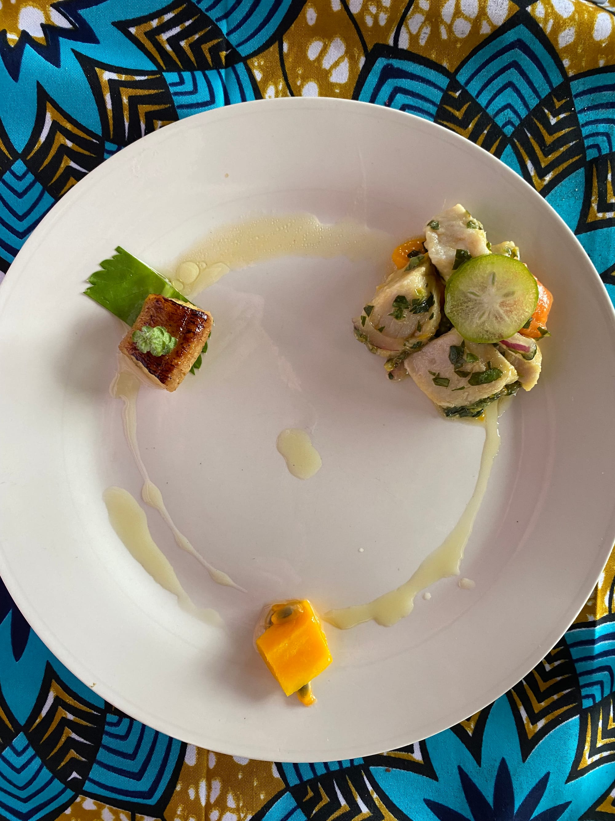 - Mango and passion fruit; carmelized banana with coriander leaf and local herbal flower; ceviche of mahi, Chinese lime, papaya.