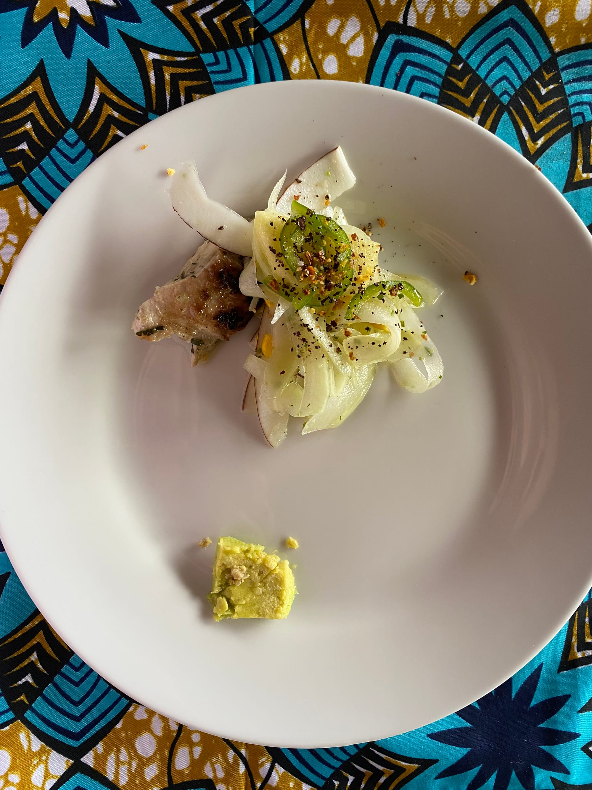 - Roasted marlin, fresh coconut, green mango, fresh pepper and ground coriander, avocado.