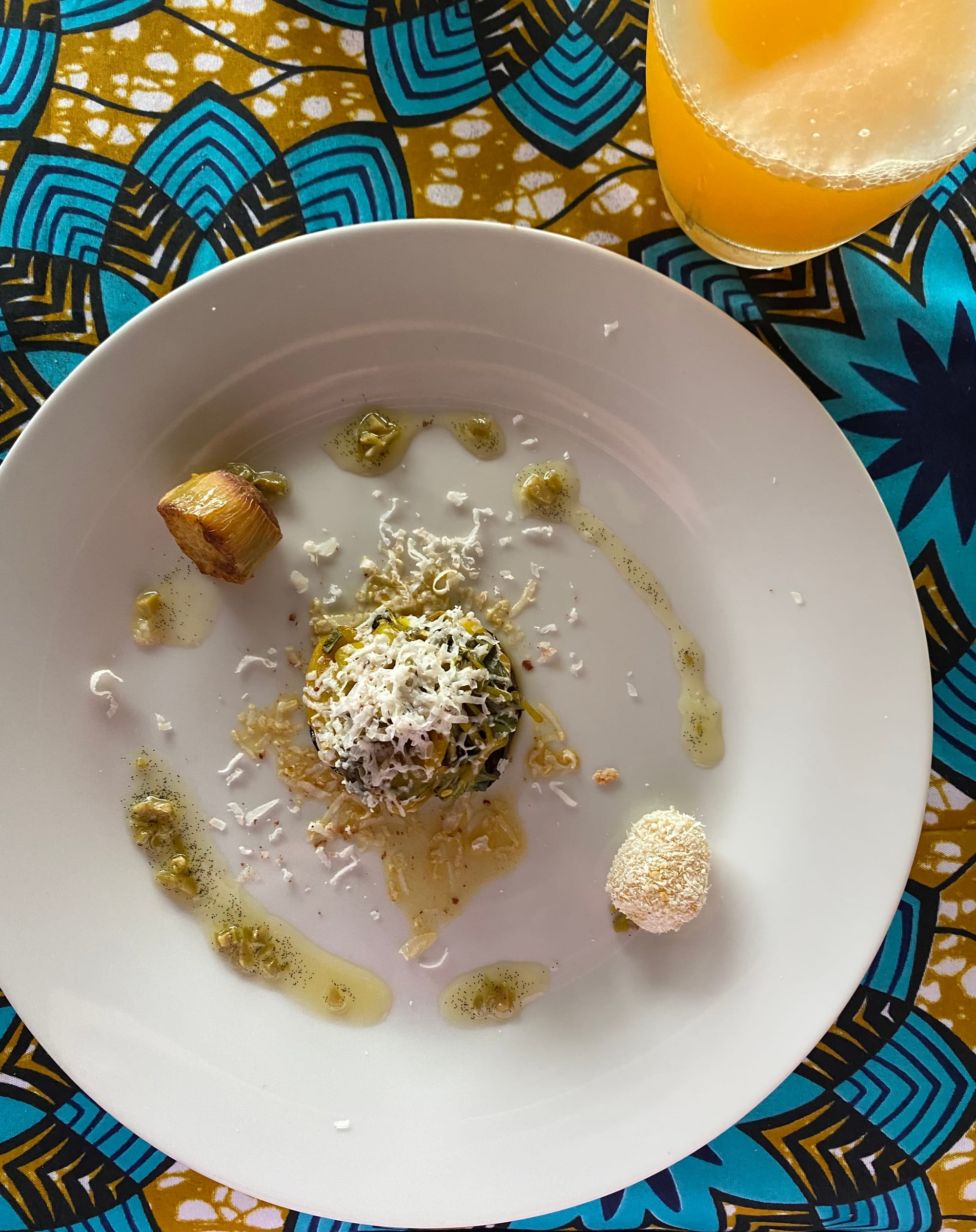 - My favorite: baked cassava with cinnamon, minced green olives and olive oil with vanilla seed; terrine of aubergine, fried fish, bell pepper, and aged Portuguese cheese; dried orange rolled in manioc.
