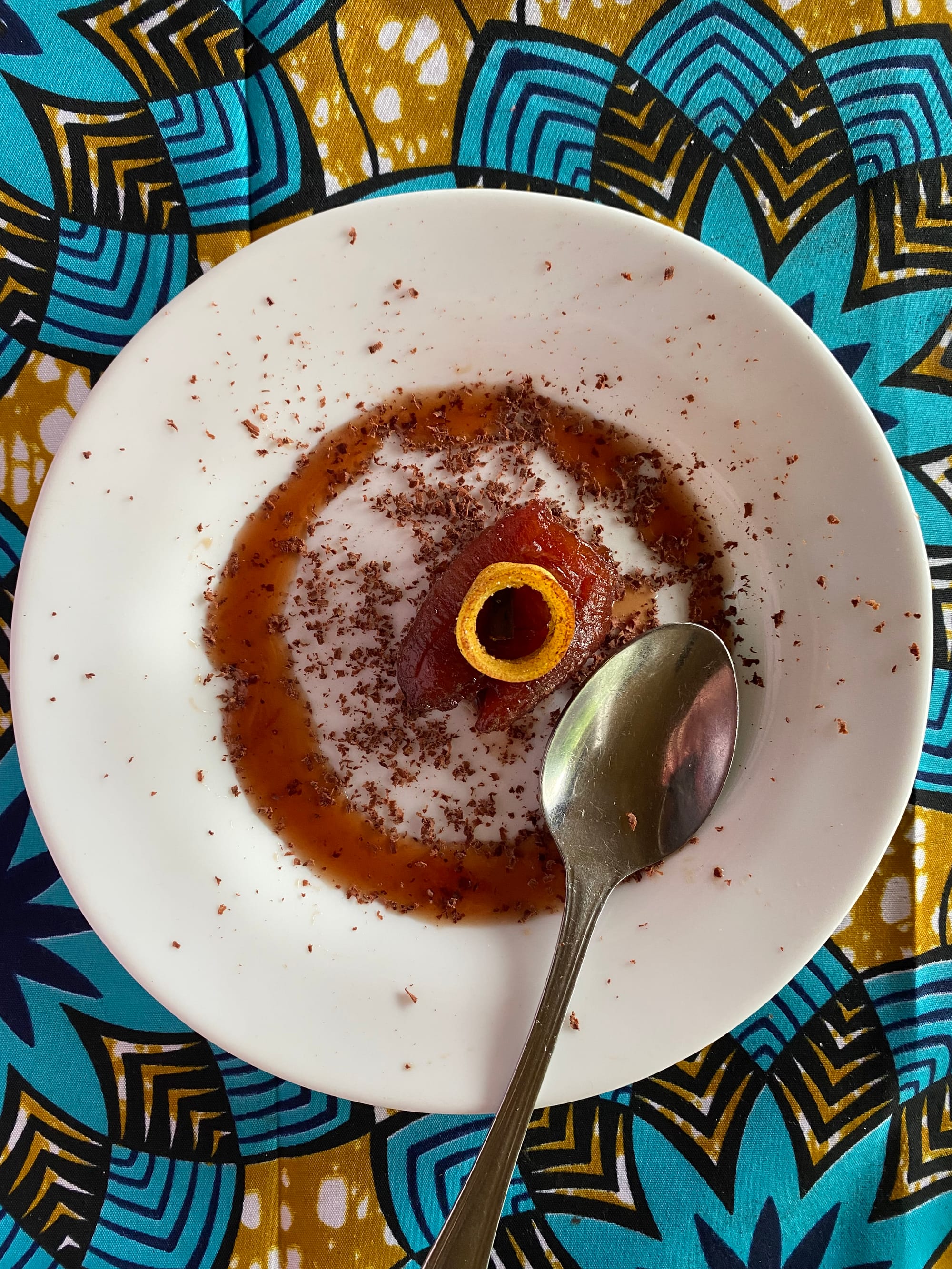 - Red wine poached banana, banana chip, cinnamon, chocolate shavings, alongside superbly strong São Tomé Arabica coffee.