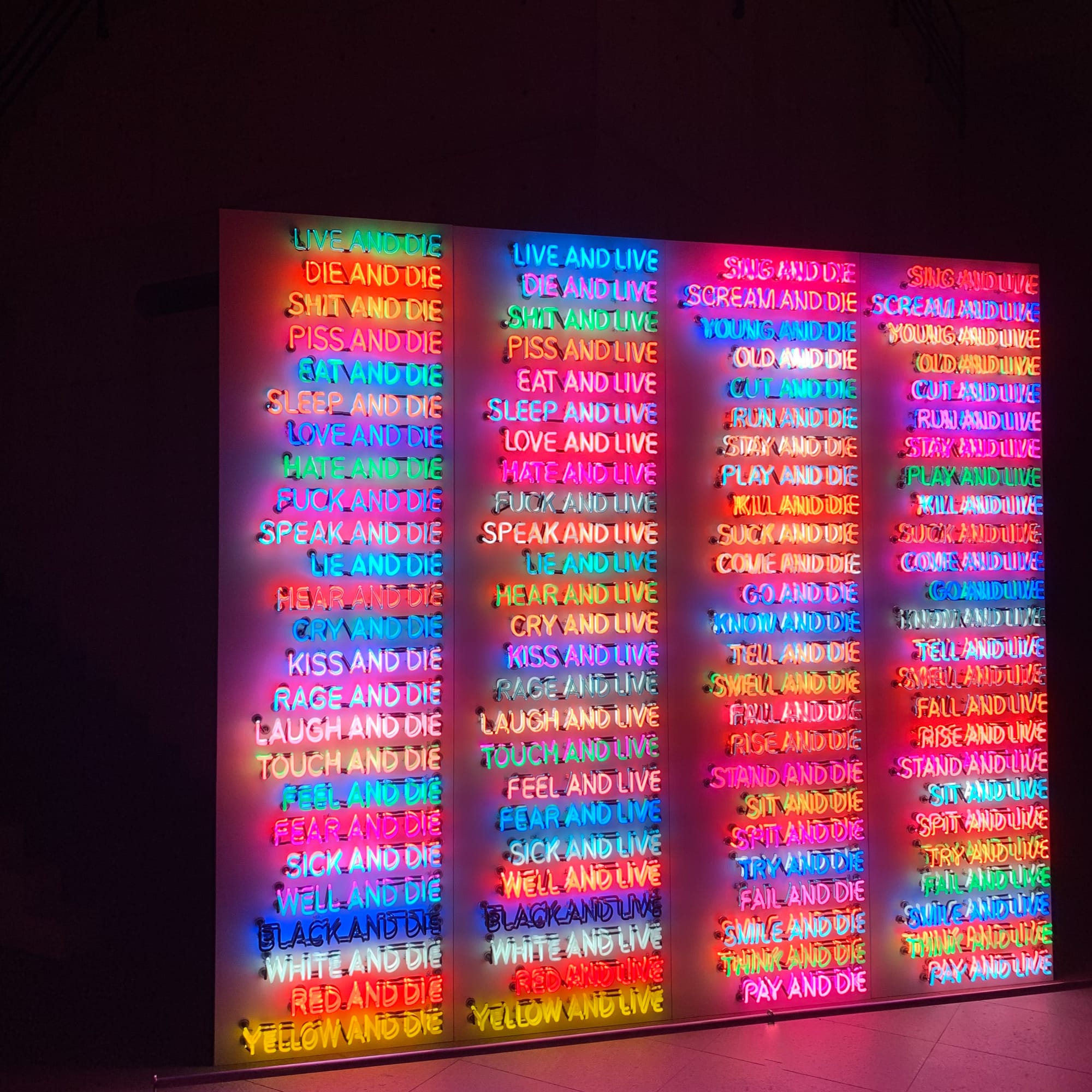 Imagery, from top left: View of Seto Inland Sea; One of the many installations across the island; View from our room at Bennesse House Hotel; A building by Tadao Ando; Bruce Nauman's '100 Live and Die'; a work by James Turrell; The Naoshima coastline; a work by James Turrell -- At top: 'Art is an Endless Struggle, Art is Love, Art is Life' by Yayoi Kusama. (Turrell photos by Benesse House and The Quietus)