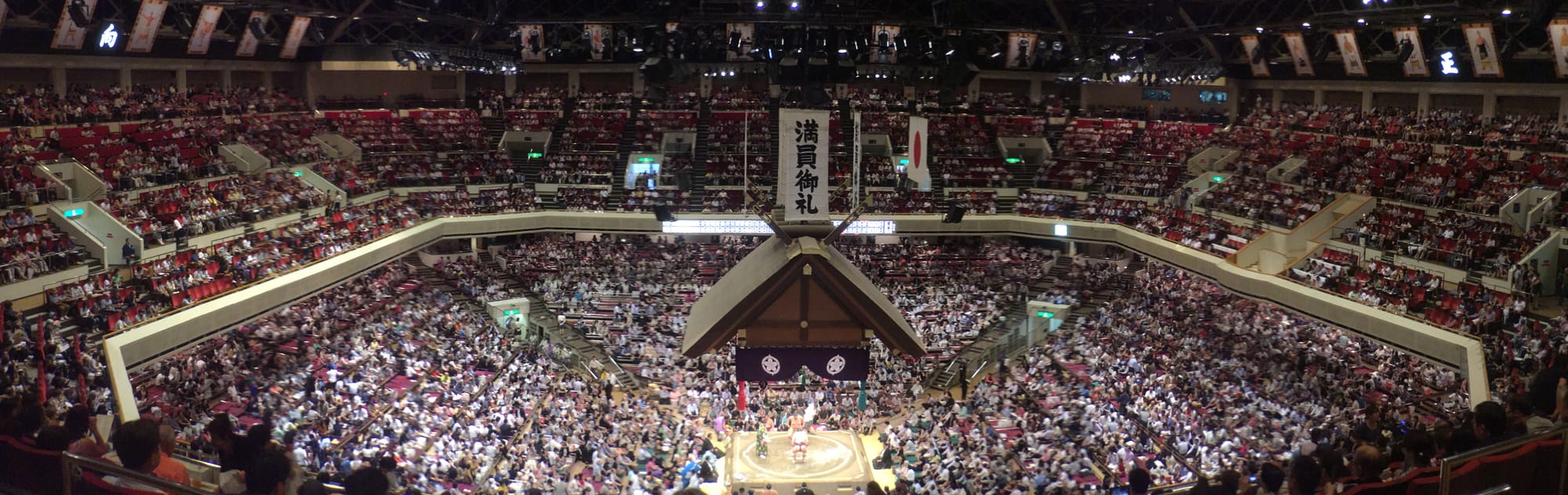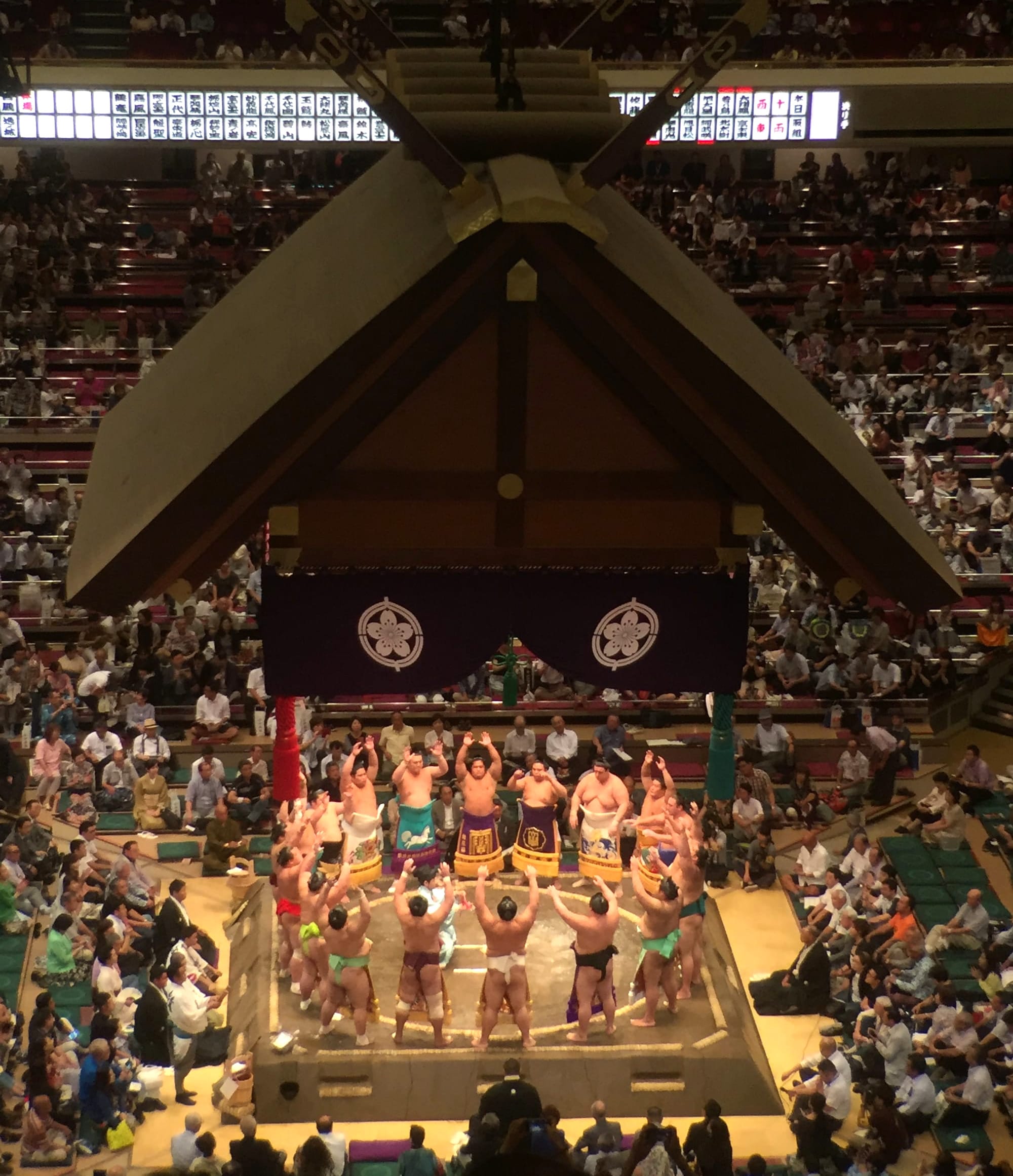 I was in the lobby of the Park Hyatt milling around the concierge desk, just racing for possibilities of things to do when I happened upon a flyer advertising today’s final in the Sumo Grand Tournament. The key being “today” – and while I’m not really a sports-fan, the idea of having a very localized sporting experience like sumo just resonated. Within a second, I knew where we’d spend our afternoon. We made our way across the city, using the very efficient metro rail, which dropped us off right at the bottom of Ryogoku Kokugikan, the national sumo stadium. Unlike most stadia I’ve been to, this one was different: sloping paths carefully formed giant public plazas, forming a ziggurat-like shape, topped by this giant, green roof. Buzzing with excitement, we made our way inside, finding our assigned seats in the top tier of this 10,000 seat arena.