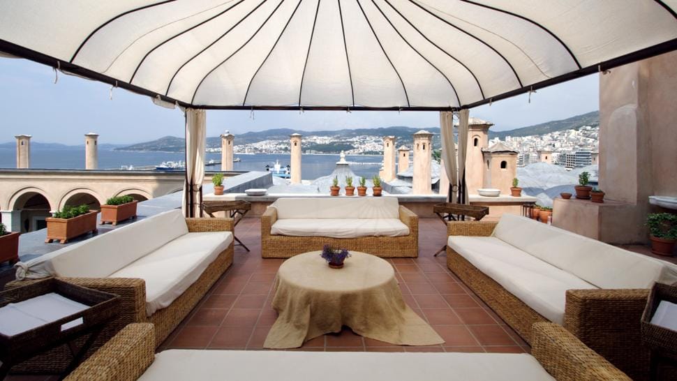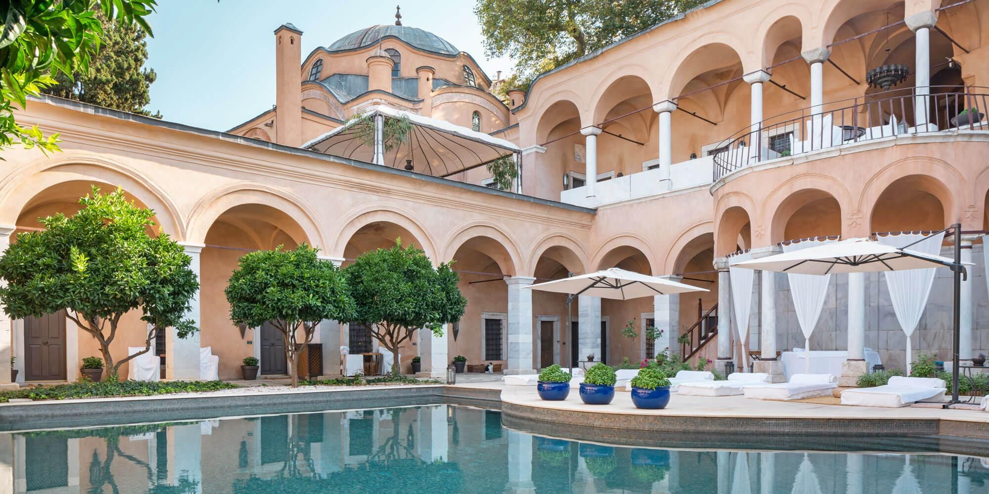 Cresting the seaside hilltop Kavala’s Old Town, Imaret is a former 19th century seminary-turned boutique hotel. The sandy pink fortress walls conceal a gorgeous courtyard pool, and provide viewpoints upon which various balconies, dining rooms, and terraces nestle. In its previous life as an Egyptian theological college, the original mosque remains as a sitting room, and the expansive gardens are best experienced strolling through the marble arcades where you might run into one of several resident felines. Many of the quaint rooms have their original plumbing, as intended in the meticulous restoration. Choose your room wisely: some are cool and dark, and others are filled with natural light with a view. Previous guests rave: “it was tempting to check in and never leave” and another who opined that the “setting is as authentic as if you were in a Scheherazade fairy tale.” The service is top notch, crowned by a nightly 4-course gourmet meal. The property offers day-passes and historical tours for outside visitors on select days, but an advanced reservation is required. Most of the negative reviews highlight that in-house guests are treated far more royally than those not staying there, for obvious reasons. Note: Imaret sometimes has a minimum stay required.