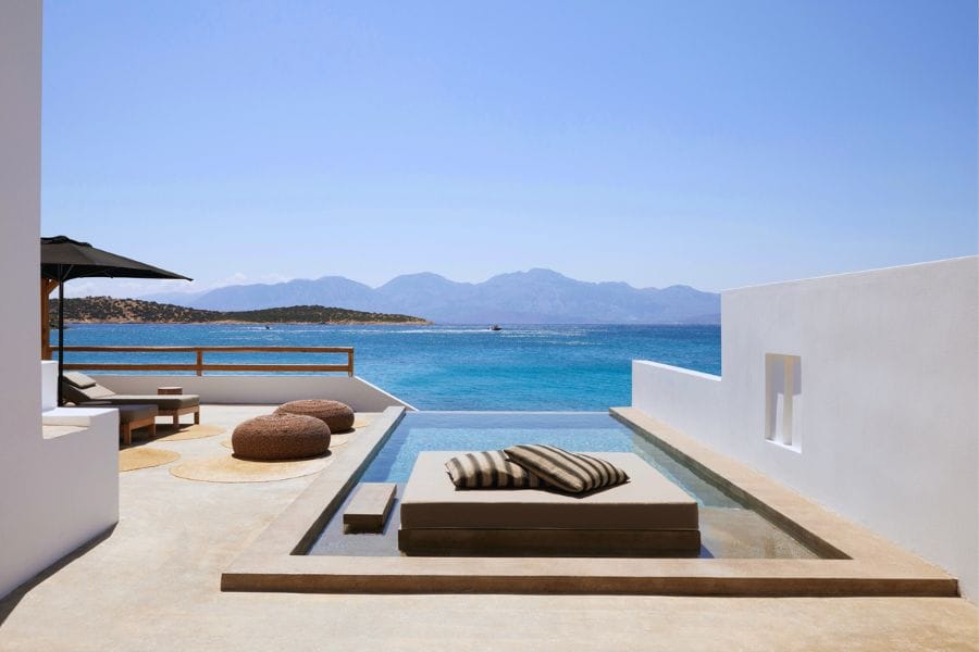 Just on the outskirts of the town of Agios and a 15 minute walk to the center, this boutique resort sits on a peninsula facing east. Two of our members have stayed here in the last 2 years, and they both recommend it whole-heartedly, noting superb food and incredibly colorful sunrises. Like the location of Agios itself, the hotel feels private, low-key, and secluded. 1, 2, and 3 bedroom villas with private plunge pools. It's luxurious but not ostentatious. Small public beach on property. 4 restaurants and a full service spa onsite. Windsurfing, sailing, and scuba available. Some seasons require a 4-night minimum stay. A few reviewers say the gym is small but adequate, others say the rooms need a refresh; generally though, reviews are very positive, calling this place “relaxing” and note friendly staff, extensive gardens. A waterfront bungalow is recommended. 45-minute drive to the Heraklion Airport. A member of Marriott's Design Hotels.