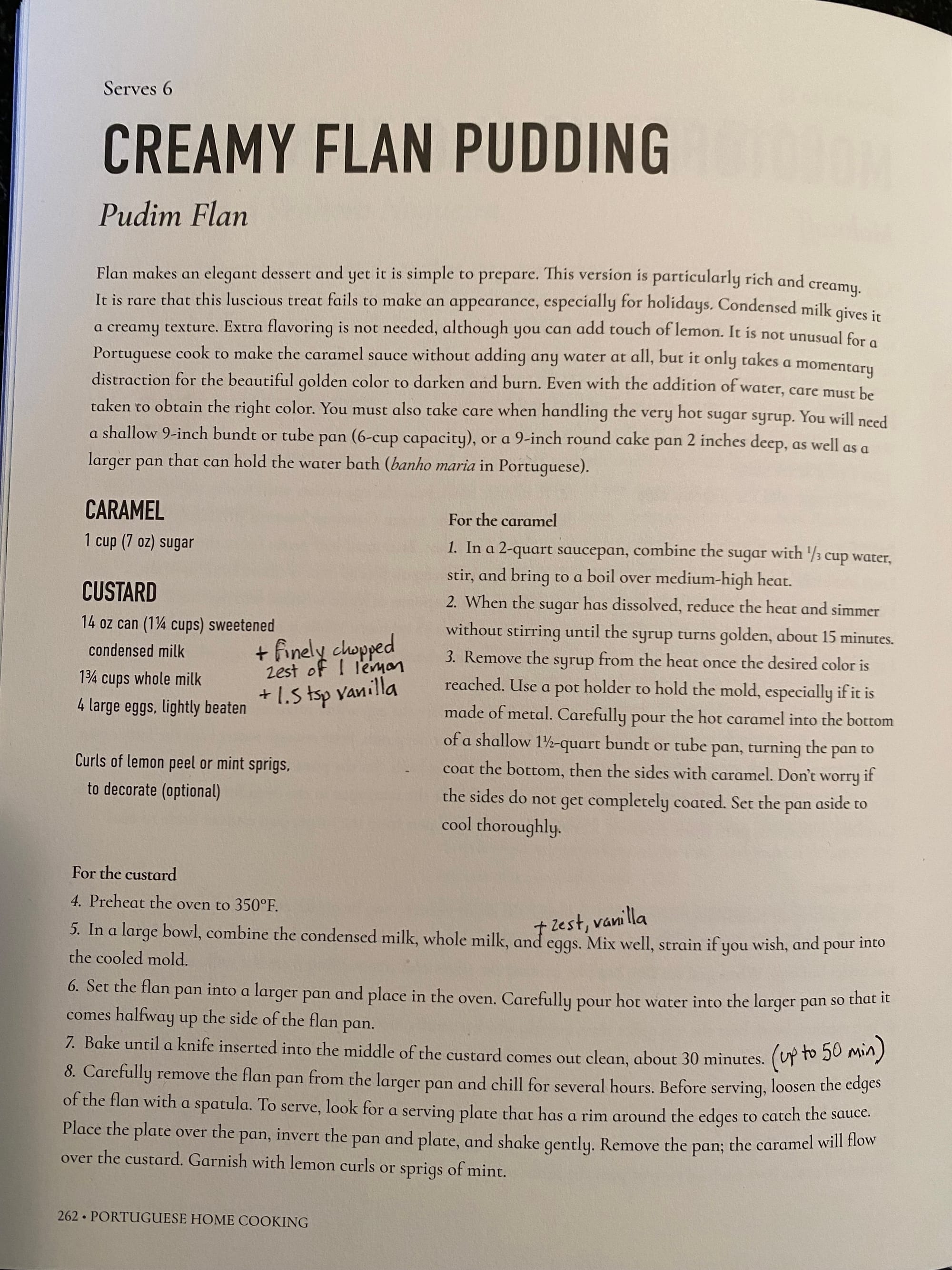 My tips: watch the caramel carefully (and don't take your eyes off of it!!); finely mince the zest of a lemon and add it to the recipe, as well as a dash of Tahitian vanilla extract; and bake it in a hot water bath in the oven.
