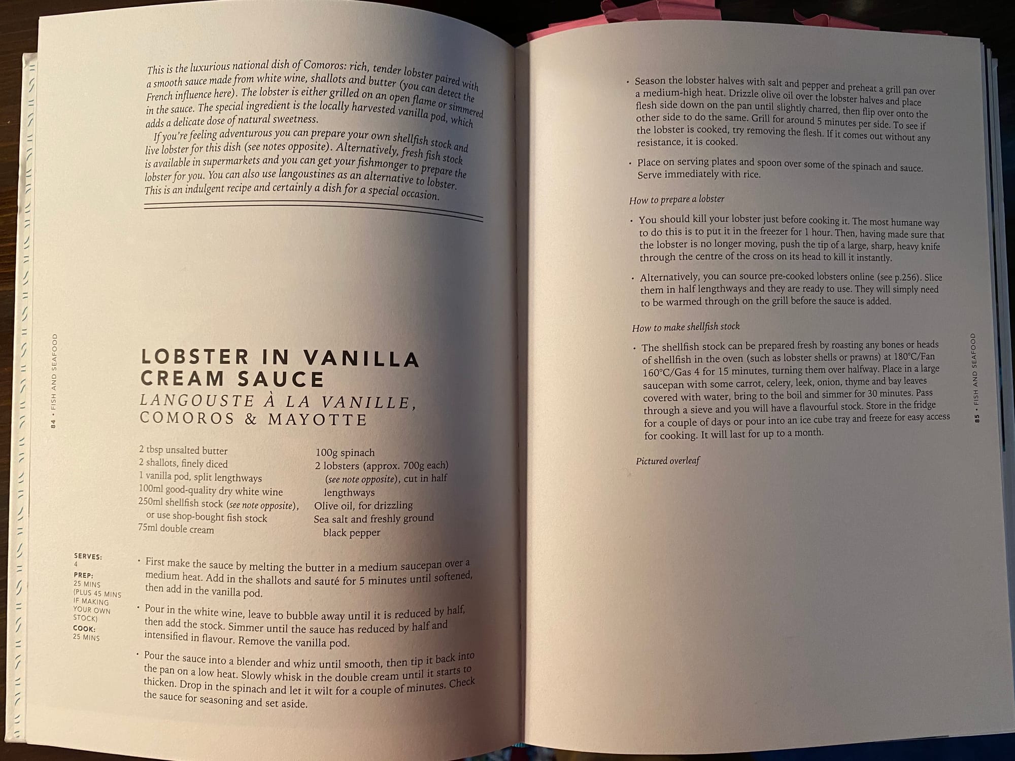 But, there is one recipe, the national dish of the Comoros Islands, that really beats them all. I was at first put off by the title of this dish, as it sounded too sweet. Au contraire, it is not. In fact, it’s one of the best things I’ve ever eaten: a wine-butter sauce scented with vanilla bean, poured over lobster and served with spinach and rice. Absolute magic!