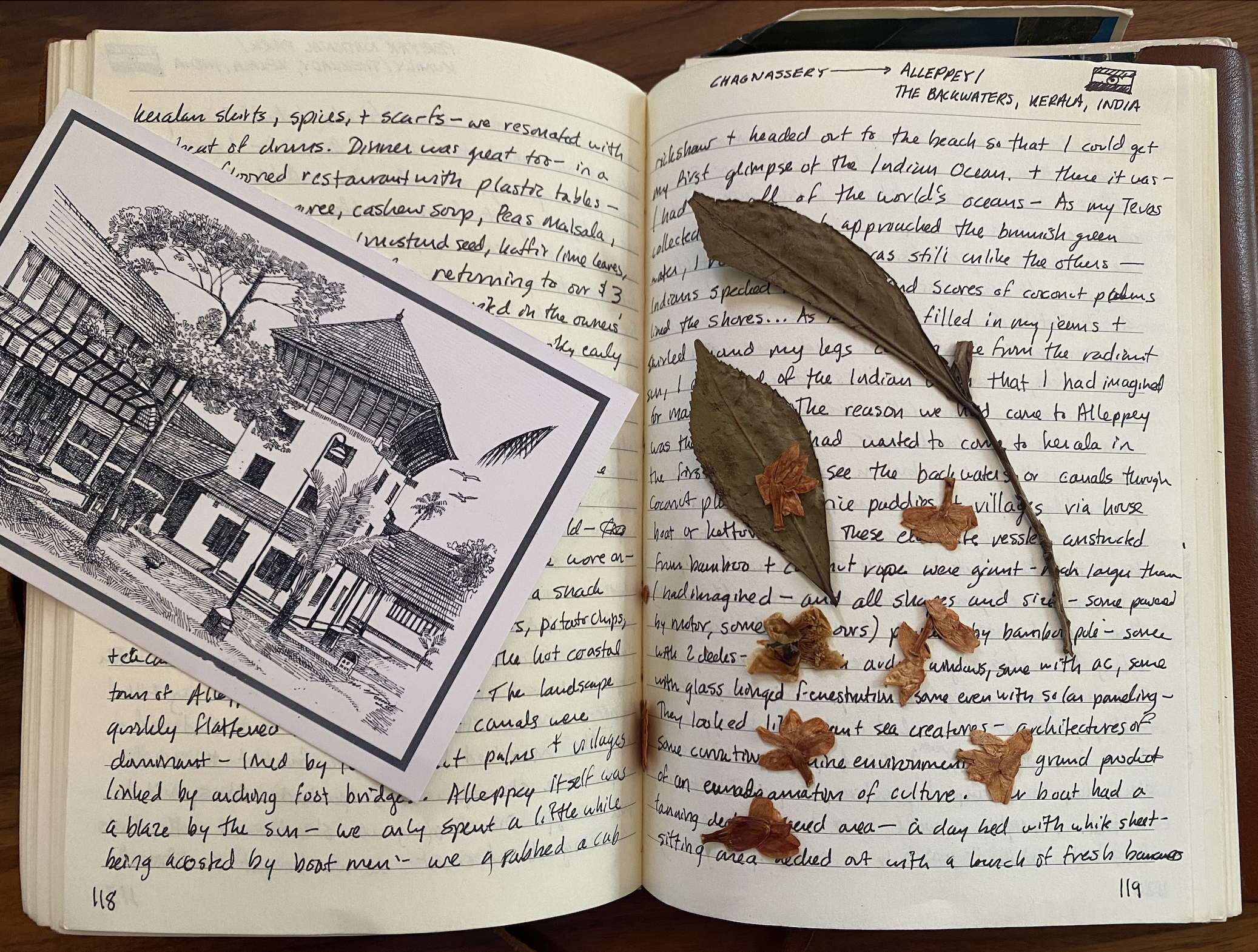 From top left: A tea picker in Munnar; a houseboat on the Backwaters of Kumarakom; Fox on the houseboat at morning light; houseboat captain; on one of many busses; Munnar village; a tea break; on safari in Periyar National Park; Coconut Lagoon Resort. At top: the tea fields in Munnar. Below: journal entry with a postcard from Coconut Lagoon and dried tea leaves from Munnar.