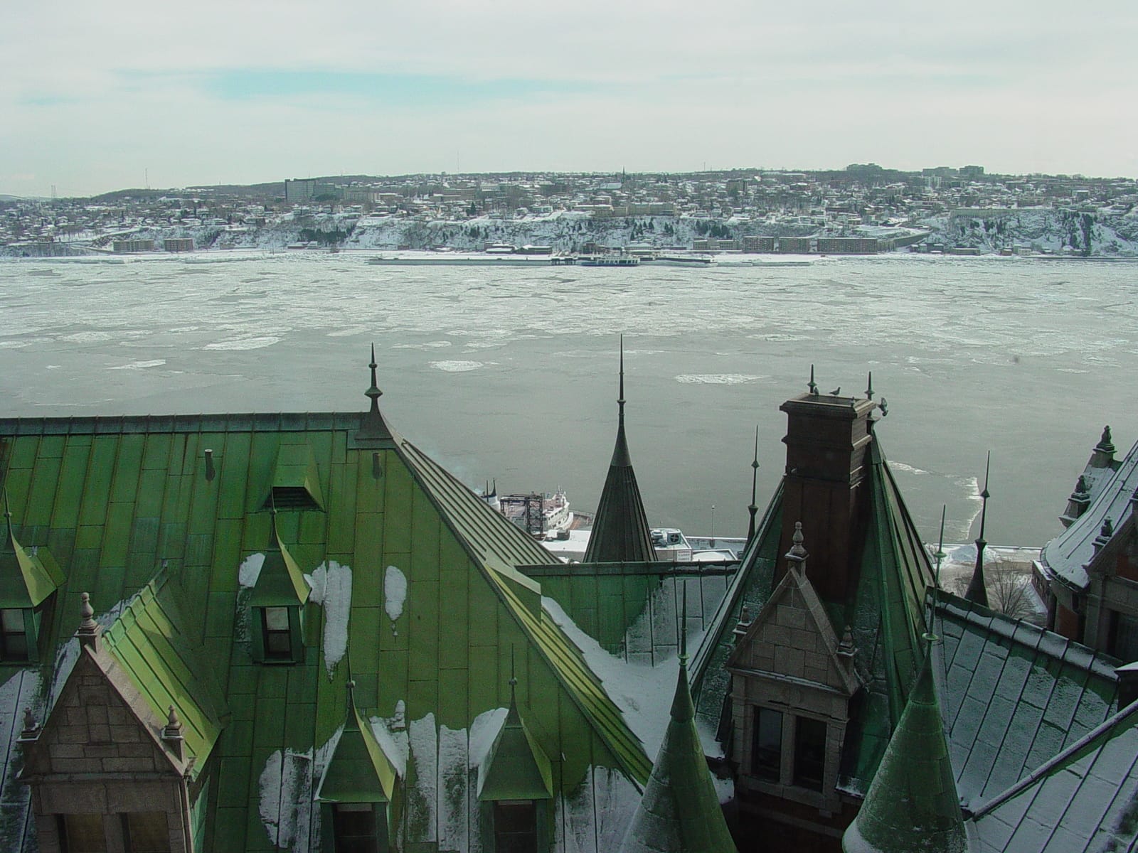 From top left: the girls doze in sleeping bags on top of a block of ice; the Ice Hotel's exterior; a window; the "survival" orientation for overnight guests; our room's view from le Chateâu Frontenac over the St. Lawrence River in Quebec City; inside the Ice Hotel.