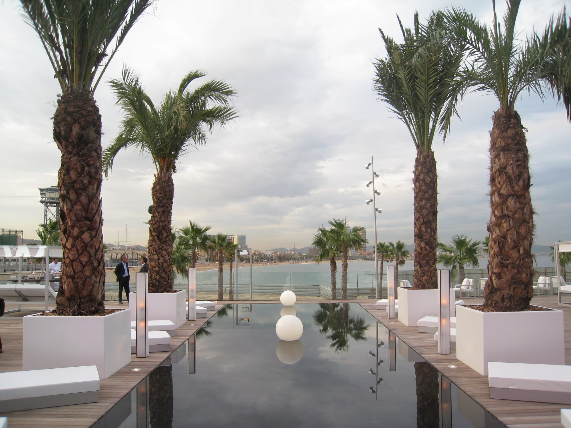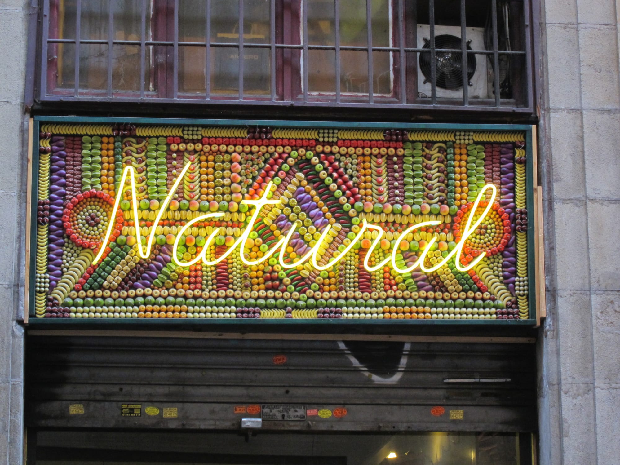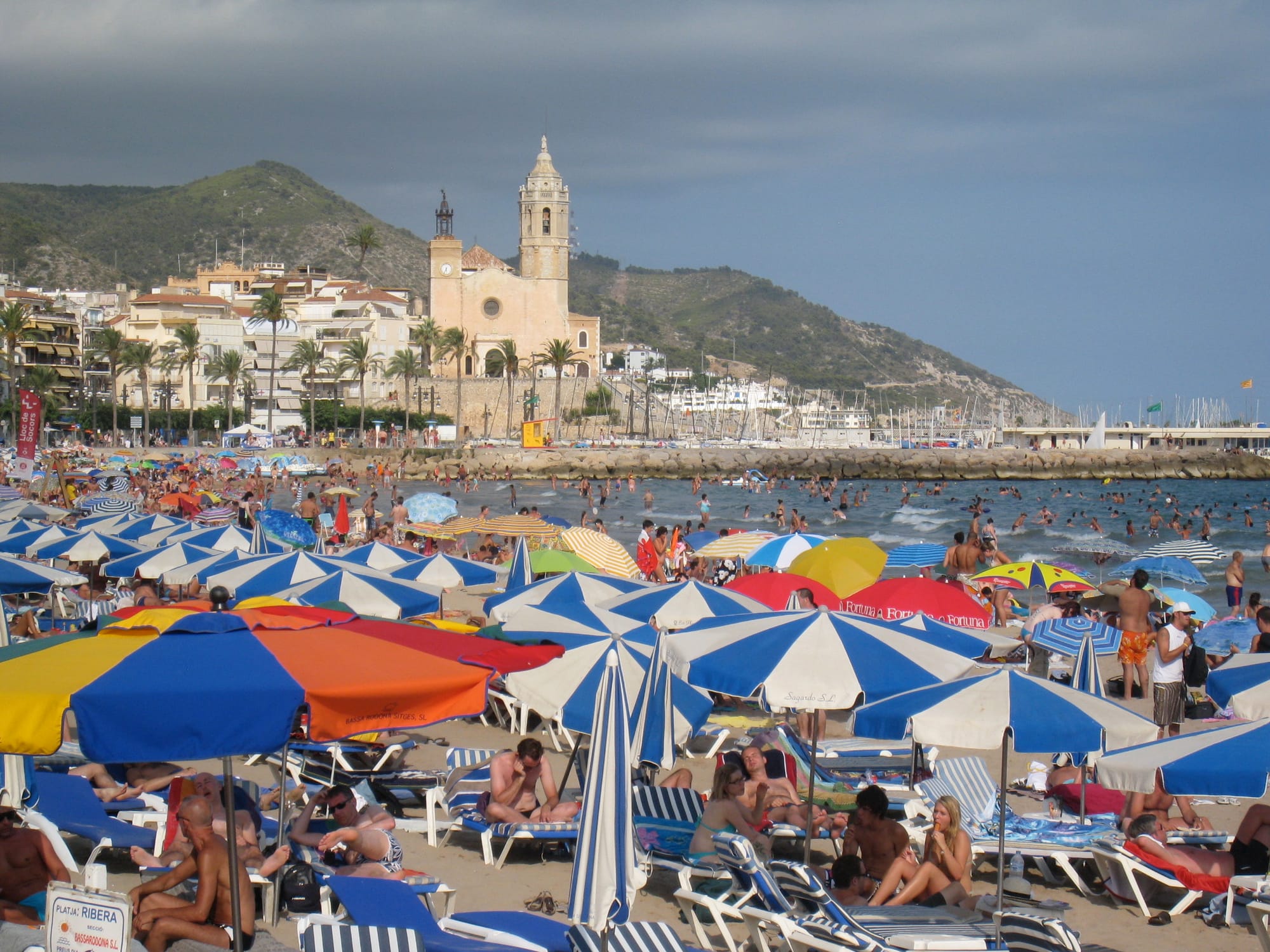 Imagery, from top left: a colorful butcher's door; fruits in the Boqueria Market; the W Hotel; Sitges; street signage; view of Barcelonetta Beach from the W Hotel; Ciutadella Park