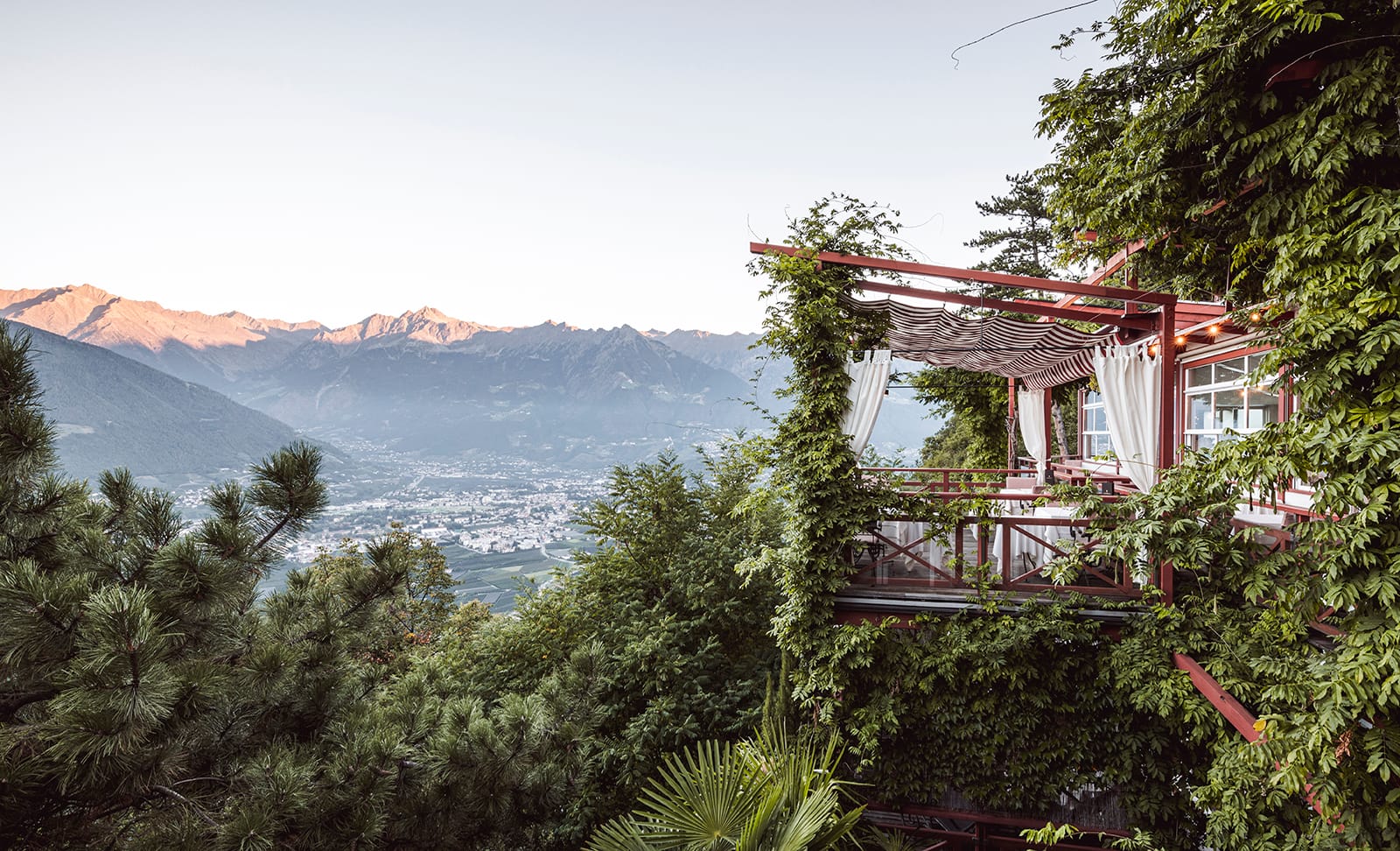 From top left: the Dolomites; Castel Fragsburg; Hotel der Waldhof; a ski summit; Miramonti Boutique Hotel.
